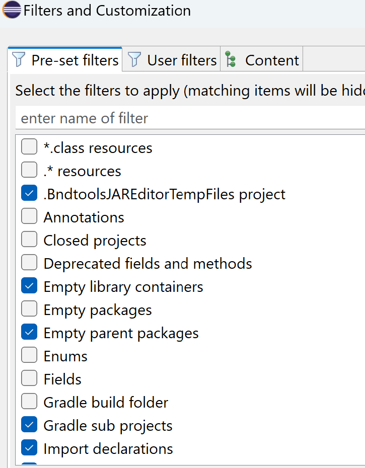 Settaggio filtri per redere visibili resources e Gradle build folder