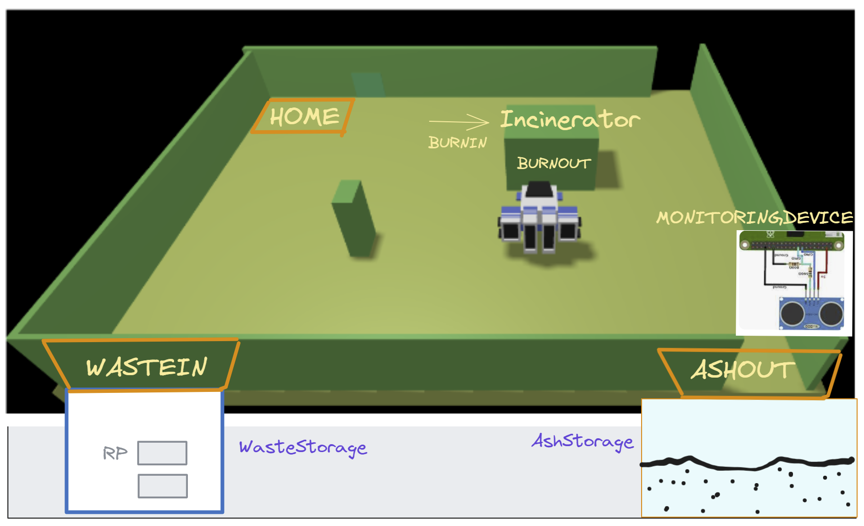 Whan the Incinerator has completed a burning phase, the Led is off, and the OpRobot moves to the BURNOUT port, picks up the ash and moves to the ASHOUT port.
